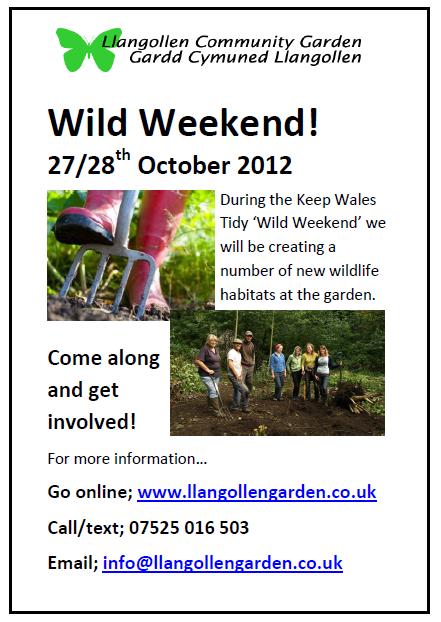 September 29th, 2012 | Posted by in Events - (Comments Off on Wild Weekend :: Come along and get involved!)On October 27th we will be taking part in the Keep Wales Tidy ‘Wild Weekend’ – We will beĀ building some enhanced habitat zones. We will use material found on the site to create brash piles. Brash piles are great for wildlife and will help mark out some of the areas on site. If you like wildlife, or just want to help, this will be a great weekend to get involved!
